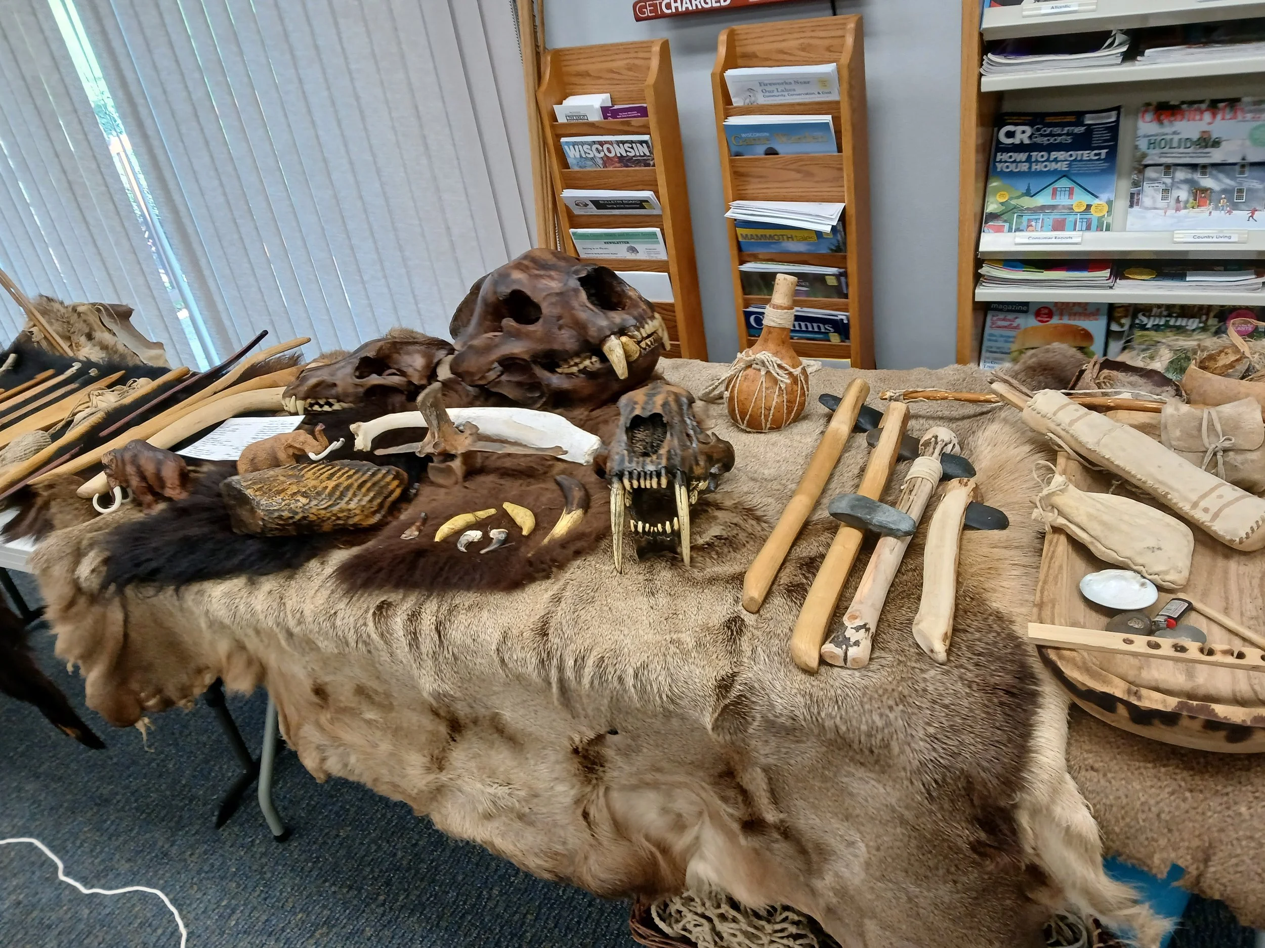 For the last several years, I have been working to build and expand a mobile museum concept. As “The Mammoth Hunter”, I travel to locations, mainly around the state of Wisconsin, USA, and bring educational programs to libraries, schools, historical societies, and other educators. I combine experiential and experimental archaeology with reenactment and storytelling to bring the upper Paleolithic to life. I have spent a great deal of time working to build the majority of my display using accurate tools, techniques, and materials.