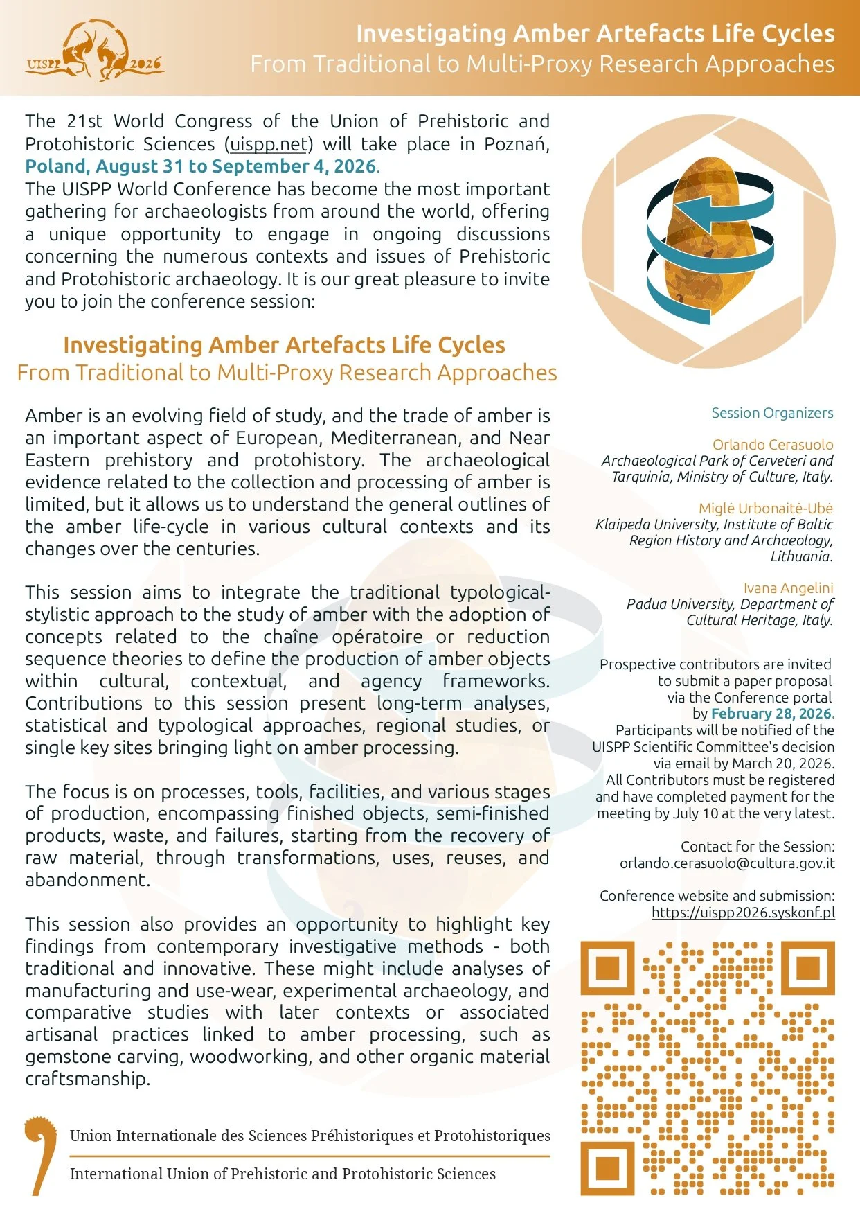 EXARC invites researchers and enthusiasts to contribute to a session on amber artefacts at the 21st World Congress of the Union of Prehistoric and Protohistoric Sciences (UISPP), taking place in Poznań, Poland, from 31 August to 4 September 2026.